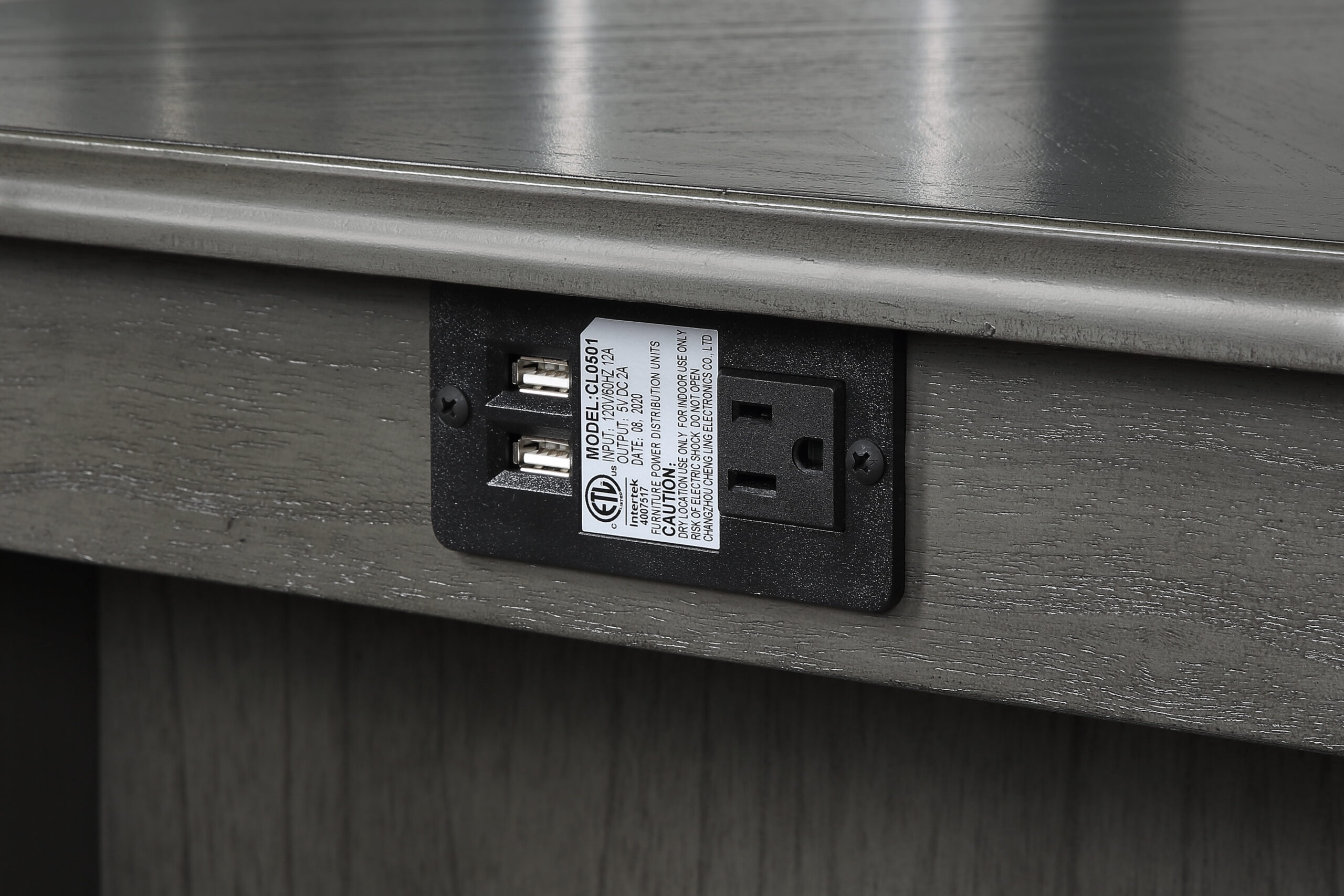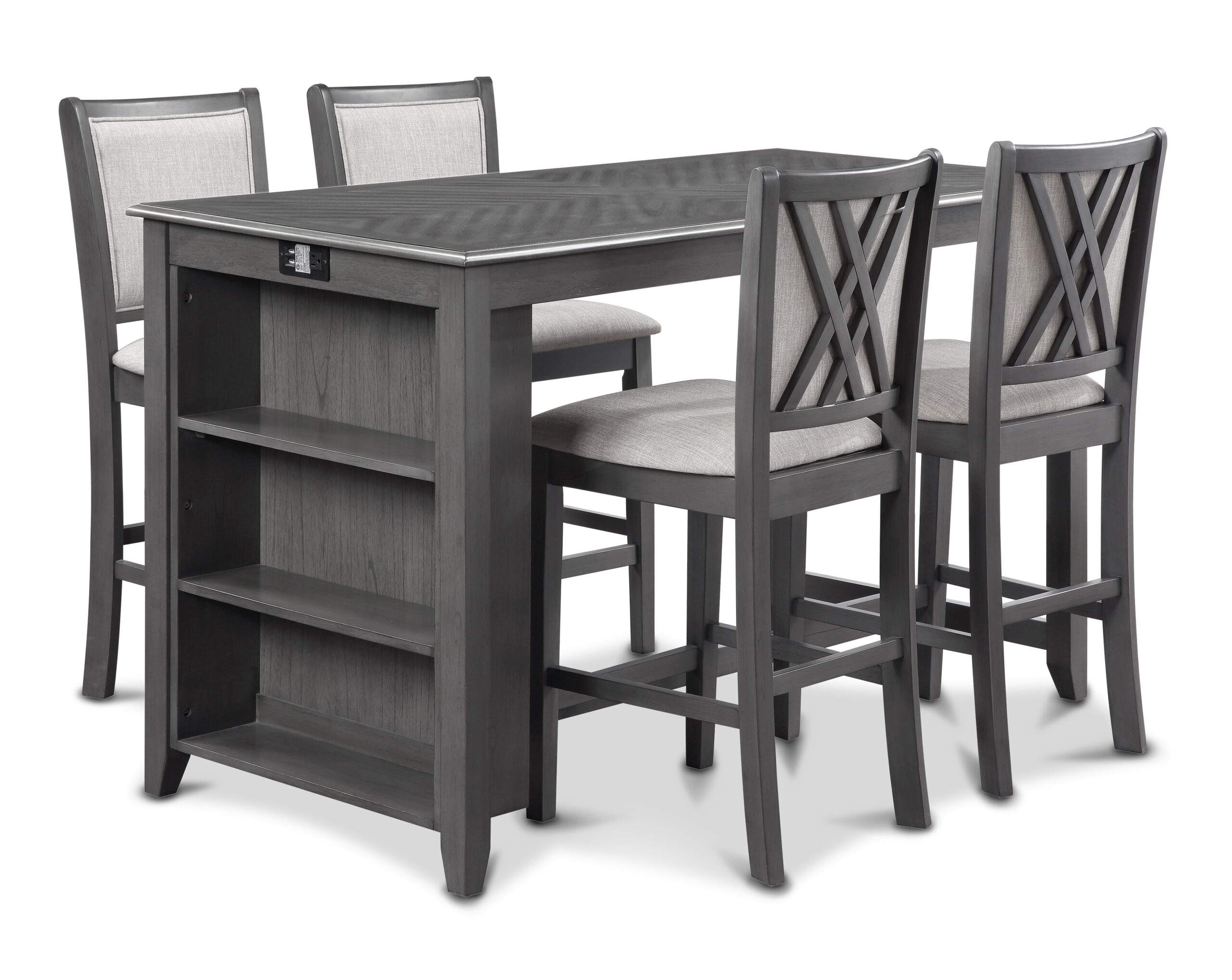 The distinctive design elements of this Amy 60-inch Counter Height Storage Dining Table, including a fancy face reverse diamond veneer tabletop, four interlocking double X frame chairs, and tapered table legs, add a touch of sophistication. Enhancing functionality, the dining set features a convenient power outlet and two USB charging ports, ensuring your devices are always ready for homework, crafting, or game play. The Amy counter storage dining set seamlessly combines form and function for a timeless addition to your home.