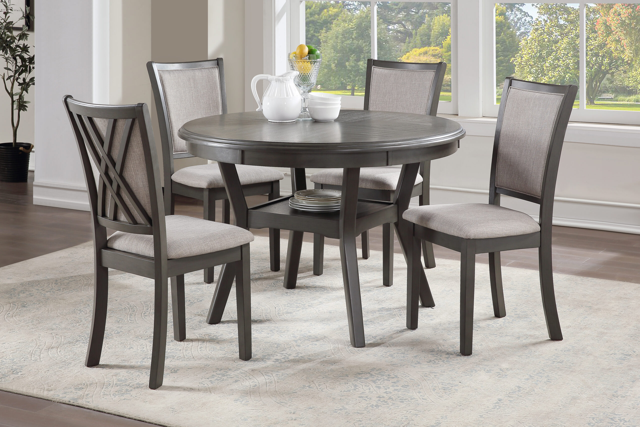 The meticulously crafted Amy 5-Piece Wood Round Dining Set includes a spacious 47″ round traditional height dining table and four chairs, designed for both durability and beauty. The solid Rubberwood and Mindi veneer construction ensures lasting quality, while the contemporary gray finish enhances the natural grain of the wood. Ideal for family dinners and game nights, the 4-person seating arrangement boasts a convenient storage shelf under the tabletop. The comfortable dining chairs feature 100% polyester light gray upholstered full foam cushions and chair backs, supported by stable solid wood legs.