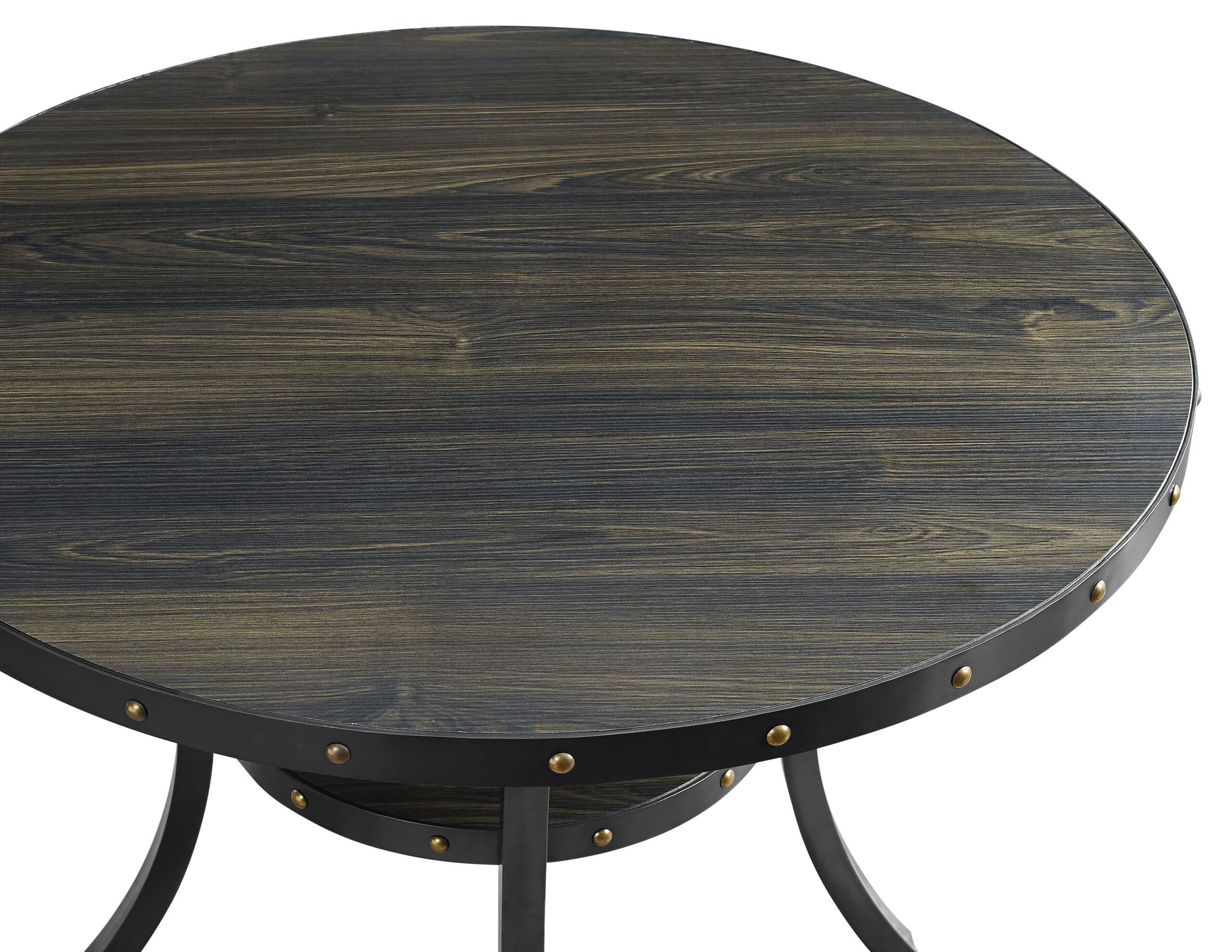 The Crispin Counter Height Dining Table features a 48″ round table top that easily accommodates 4-person seating. It is crafted of solid wood and manufactured wood and features a scratch, water and heat resistant melamine top. Sturdy metal legs that add character and long-lasting quality highlight the contrasting trim with nail head accents that circles the dining table. The unique wire brushed table top treatment highlights the smoky browns, black and grays in the wood finish. The handy storage shelf below the table top adds support and function. Perfect for dining rooms, kitchen nooks, media rooms-anywhere you need a casually rustic, durable and comfortable gathering table.