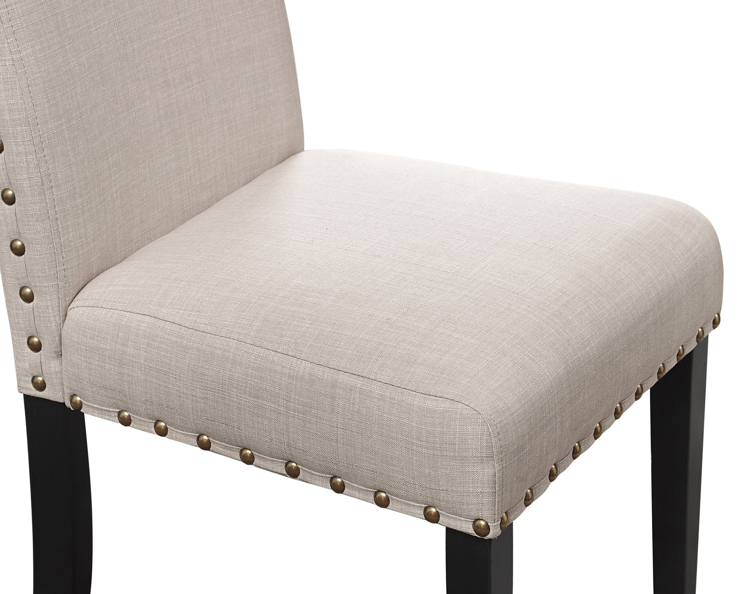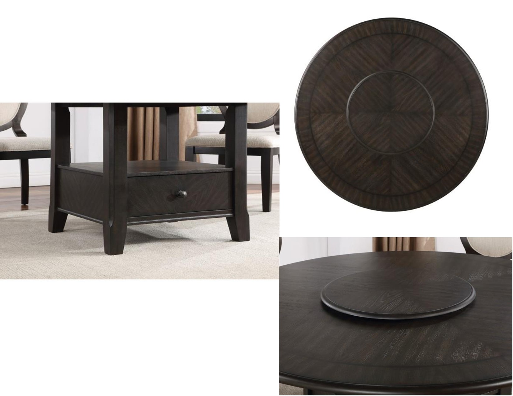 Add luxury to your decor with this visually stunning 7-piece NewForte Dining Table by Furniture of America, exclusive to Nations. Wooden frames are finished in dark espresso with beige linen colored chairs that feature bronze nailhead trim. For convenience, there’s a lazy Susan on the round table top and an open bottom shelf and two large drawers below for extra storage.