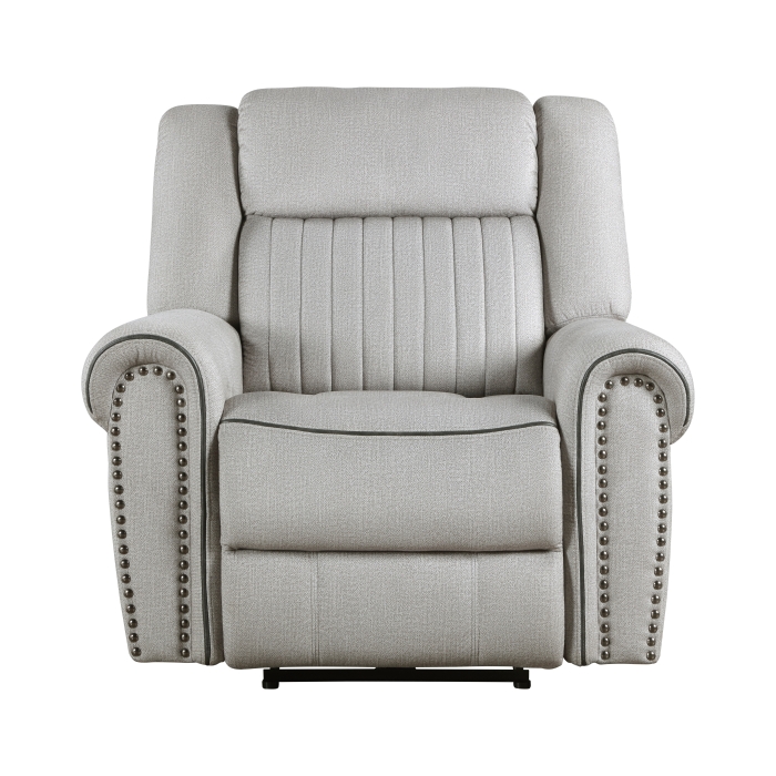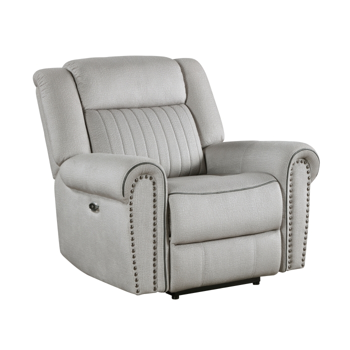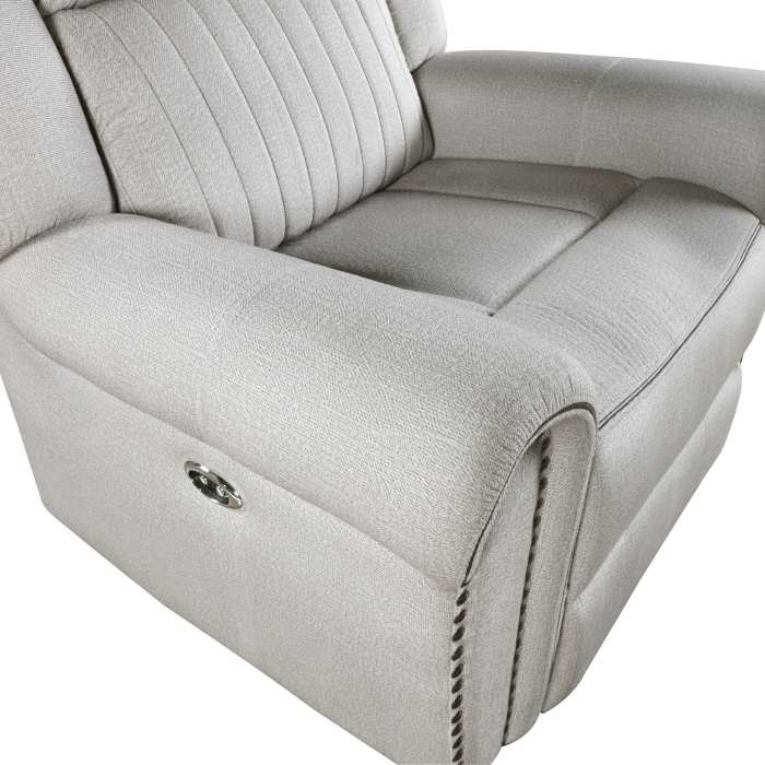 Styled for the transitional home, the Brennen Collection’s comfortable presence will be a perfect match for your casual living room. The chair features a power reclining mechanism allowing for ease of motion when going from seated to reclined. Plush seating is defined by the contoured stitching, while the arms of the chair are accented with nail head trim. Mist-hued textured microfiber covers the seating group, providing soft touch and decorative versatility.